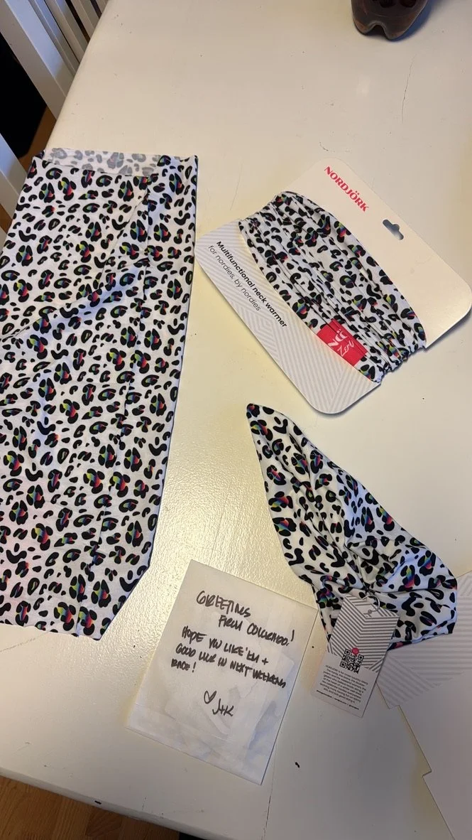 I told them I have been dreaming of a custom neckie inspired by my love of leopard prints. If you haven’t noticed, you might now. I have lots of cheetah and snow leopard print clothing like bike shorts, gloves, town outfits, etc. I hand-made a fleece neckie with fabric from Joanne’s (who have sadly closed RIP) and raced my first IBU Cup wearing it. I shared my love for this jungle cat and my desire for a custom neckie, so together we took this white cheetah base and paired it with Nordjork's colorful flare, the result is ...